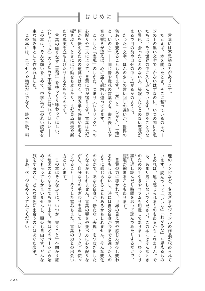 もう一つの挑戦が、「読むこと」と「書くこと」をつなぐこと。僕は「作家の時間」「読書家の時間」の実践を通して、両者の強いつながりを感じている一人です。本書は基本的には「読み物」ですが、「レトリックの道標」や「手引き」には、書くことを誘うもの、書くきっかけになるものがたくさんあります。そしてなにより、読むことと書くことのつながりについて書いた巻頭の安房直子「言葉と私」、終章の向坂くじら「『あとで書こう』と思うとき」の2つのエッセイが響き合って、読み手を強く惹きつけるはず。そんなふうに、本書全体で、読み手を読むことを書くことの往還に誘っています。